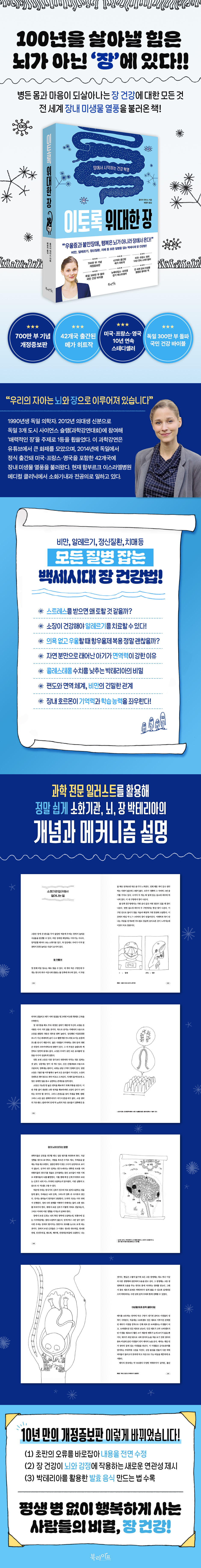 스트레스를 받으면 왜 토할 것 같을까? 배에서 꼬르륵 소리가 나는 건 정말 배고파서일까? 2014년 독일에서 처음 출간되어 전 세계 장내 미생물 열풍을 일으킨 《이토록 위대한 장》이 700만 부 판매를 기념해 개정증보판으로 출간됐다. 초판의 오류를 바로잡아 내용을 전면 수정하였으며, 장 건강이 뇌와 감정에 작용하는 연관성과 박테리아로 발효 음식을 만드는 내용을 새롭게 업데이트했다.